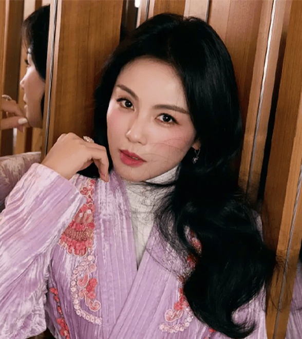 刘涛淡紫刺绣套装亲切温婉,抬眸神态优雅又妩媚