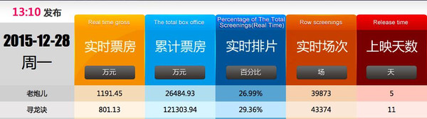 18日首映的《寻龙诀》最近势头较猛,到今天 13点,累积票房已经达到12.1亿。