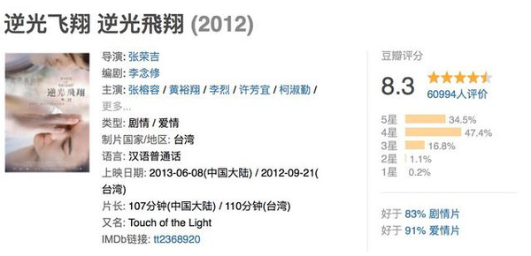 豆瓣评分高达8.3,好于83%的剧情片,好于91%的爱情片。