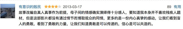 故事改编自真人真事作为前提,母子间的情感确实演绎得十分感人,要知道我本身并不喜欢残疾人题材,但是这部影片都没有通过情节而博取观众的同情,更多的是一份内心真挚的感动,让我们看到盲人的勇敢,看到了勇敢的力量,让我们知道勇敢是可以传递的,信心是可以共造的。