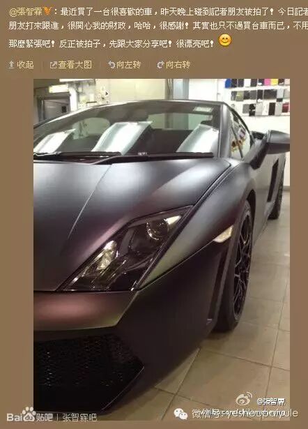 张智霖于是索性把爱车PO上网,并说:“本来买了一台很爱好的车,昨天晩上碰着记者朋友被拍了!本日记者朋友打来跟进,很关怀我的财务,哈哈,很感激!其实也只不过买台车而已,不用那么严重吧!反正被拍到了,先跟大家分享吧!很漂亮吧!”