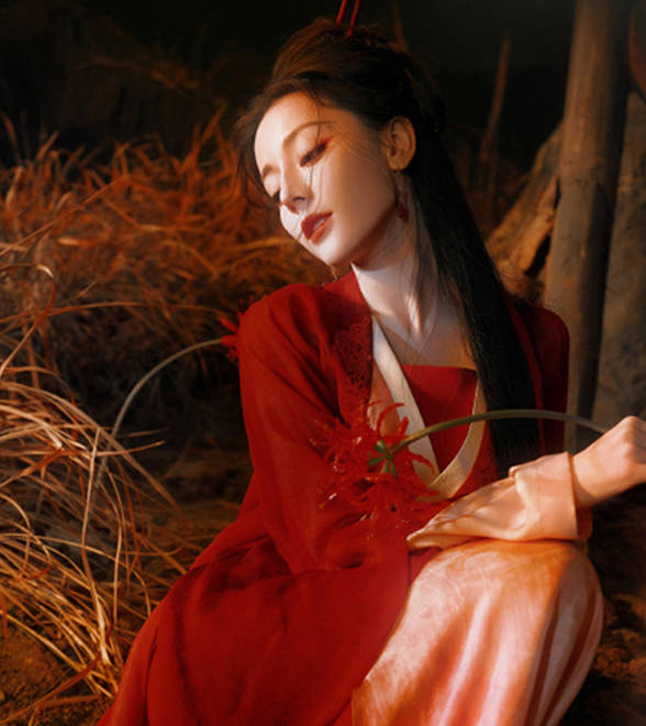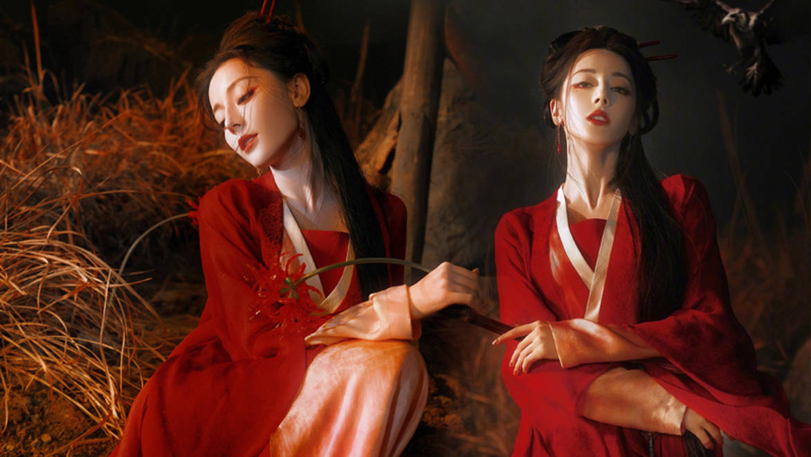 迪丽热巴一袭红衣提灯持伞,血痕妆容凄艳魅惑