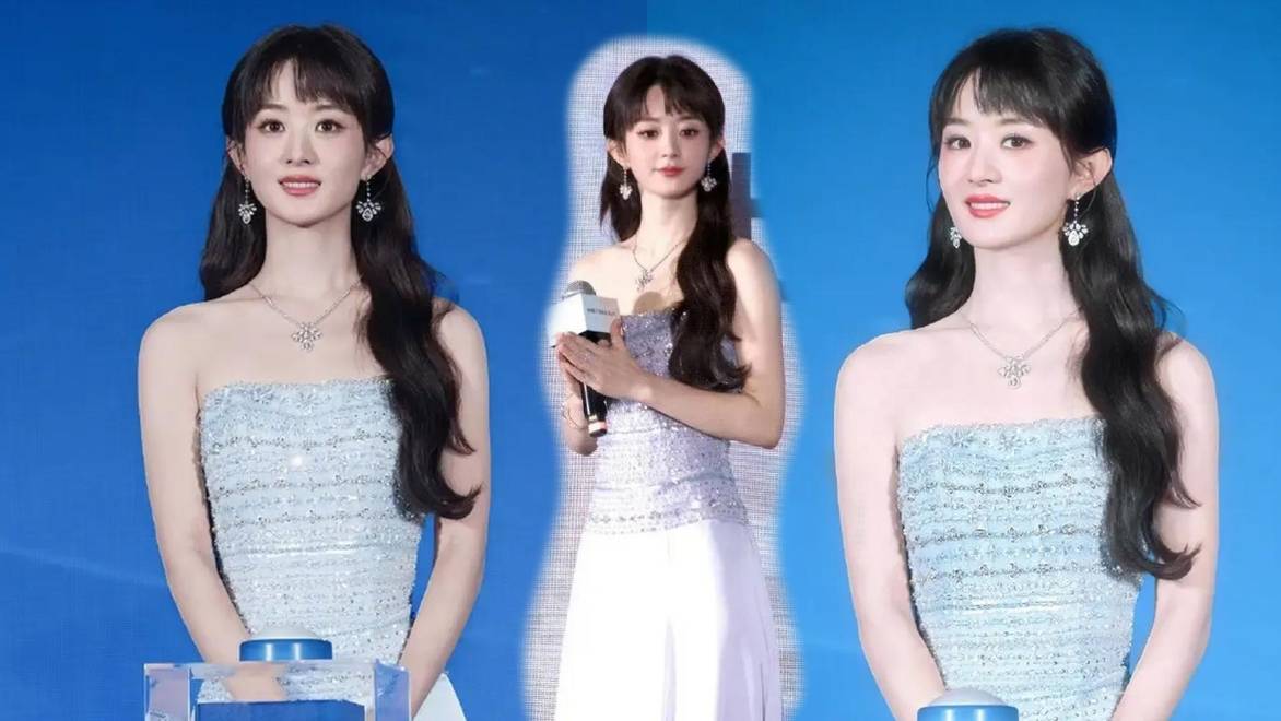 赵丽颖穿抹胸蓝裙气质优雅,美得让人移不开眼