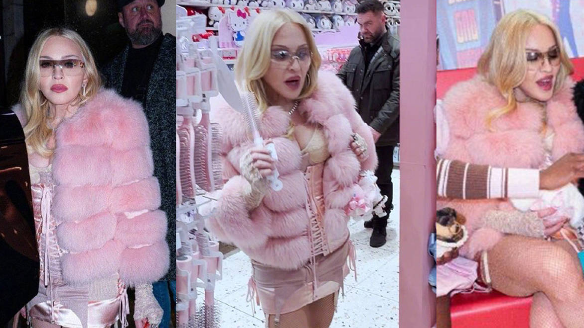 麦当娜穿粉色皮草身材傲人,持战利品开心留念