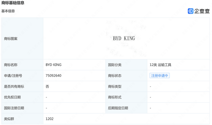 ● 比亚迪注册新商标“BYD KING”,预示着新车型的到来