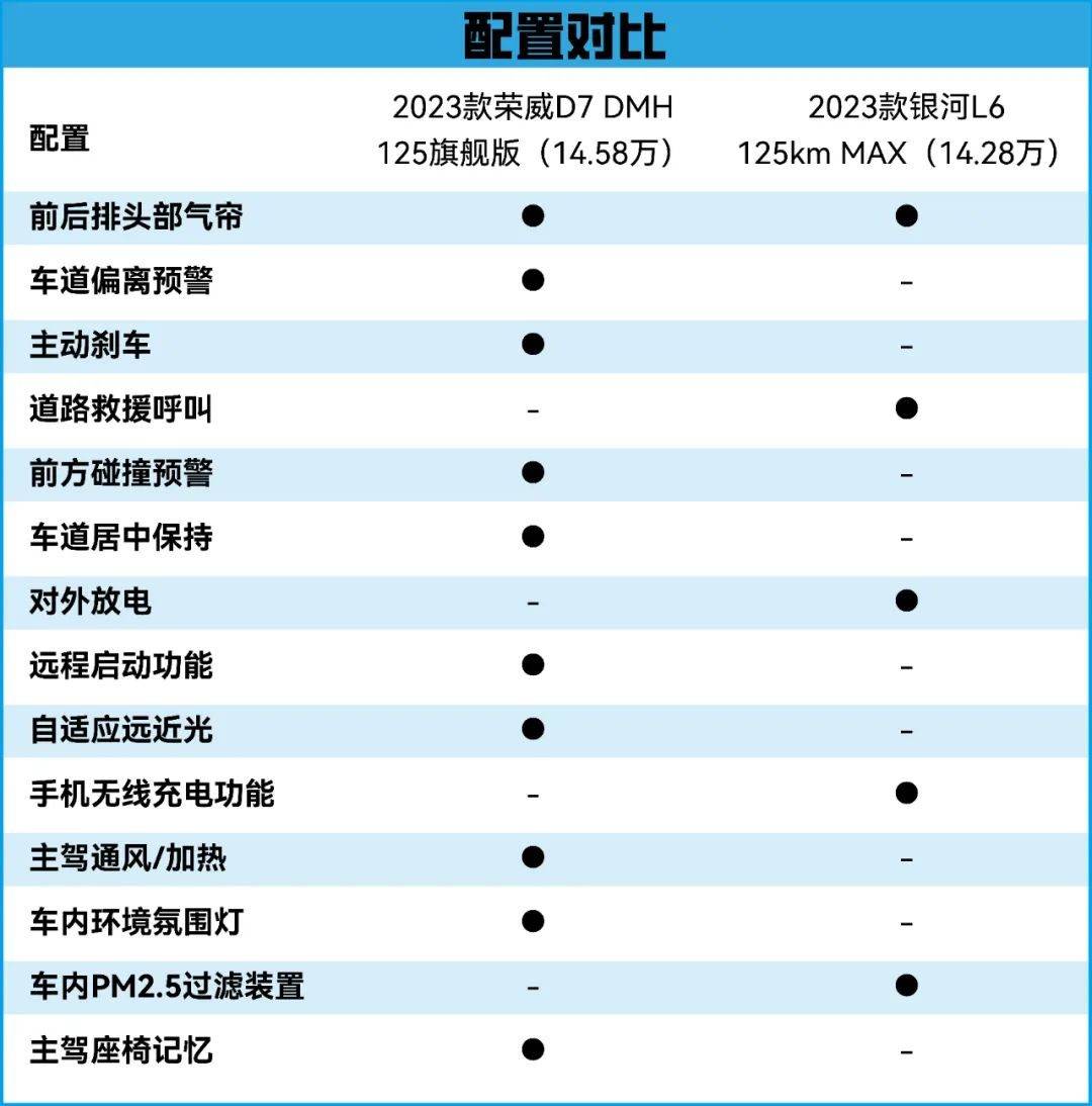 荣威D7 DMH目前只有125km(CLTC纯电续航)版本,吉利银河L6的CLTC纯电续航则有60km和125km。轱辘哥选取两款车型的125km版本进行对比。在价格相近的情况下,荣威D7 DMH的配置会更丰富一些,比如荣威D7 DMH的125旗舰版配备主驾通风、加热功能,还有自适应远近光、氛围灯等,这些是银河L6的125km MAX版所没有的。