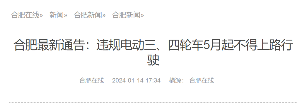 在2024年1月的时候,合肥已经有最新通告,明确违规电动三、四轮车5月起不得上路行驶。