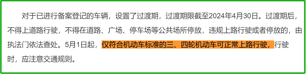 而根据合肥此前发布的《关于加强违规电动三轮四轮车管理的通告》,明确违规电动三四轮车,应当悬挂具有截止日期的黄底黑字的临时号牌,而截止日期为2024年4月30日。