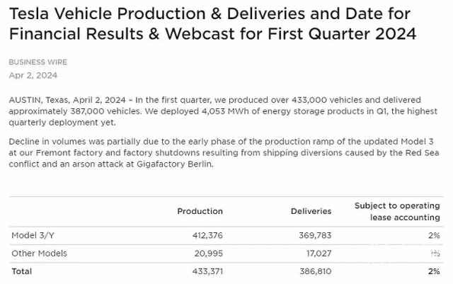 这是自近4年来首次季度交付量出现下滑的情况,甚至2022年第三季度以来首次跌破40万辆关口。这一结果远低于此前一些业内人士对特斯拉一季度交付量将达到45.7万辆的预测。作为全球电动车行业巨头,特斯拉今年这个业绩堪称“灾难级”了。