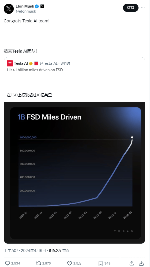 而根据特斯拉官方此次宣布,截至目前,特斯拉全自动驾驶累计行驶10亿英里(约16亿公里)。马斯克更是信心满满地预告:“用不了多久,特斯拉的FSD行驶里程就会超过100亿英里。”