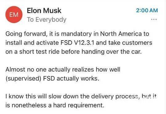 更让人意外的是,马斯克还硬性要求北美地区的特斯拉销售,在交车前必须带用户短途试驾FSD,哪怕会影响新车交付的速度也要执行。马斯克称,几乎没有人真正意识到FSD实际工作的优秀表现,尽管这样做可能会延缓交付过程,但这一要求仍然是非常重要的。