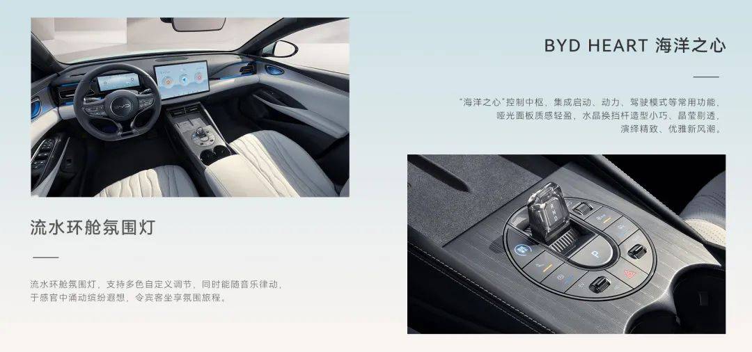 整个内饰的设计风格,我愿称为简约舒适。颜色搭配偏暖色调,流水环舱氛围灯随着音乐律动,营造出清新的氛围感。海洋之心的控制中枢,精致小巧,特别是这个水晶换挡杆,布林布林的,作为女孩子来说,我是很喜欢的。