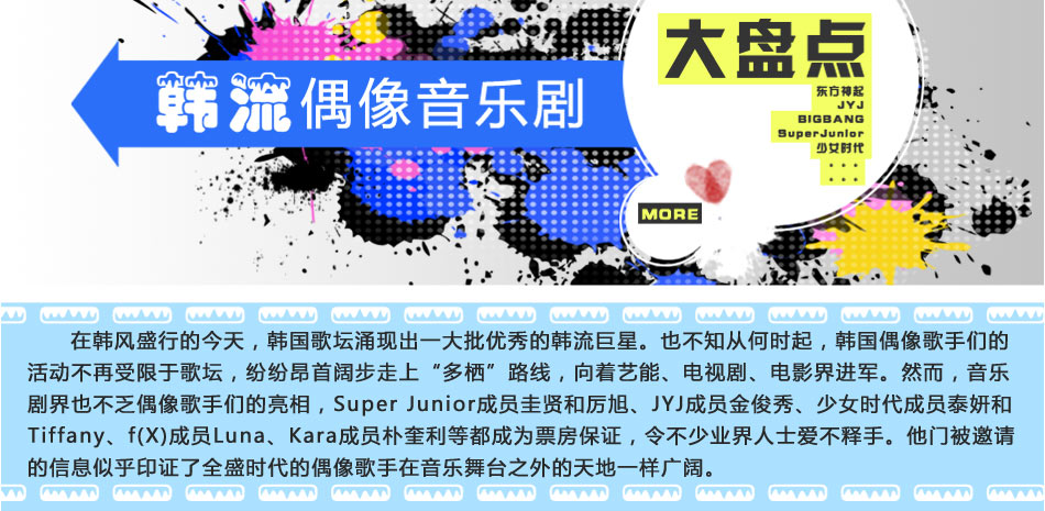 少女时代 Tiffany:《Fame》Tiffany凭借与Sj的银赫,Trax的政模共同出演的《Fame》首登音乐剧舞台,大展身手。 泰妍:《太阳之歌》 首次挑战的音乐剧选择的是改编自日本同名小说的《太阳之歌》。